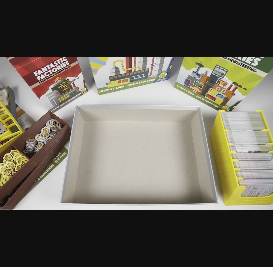 - Les inserts empilables individuels ont été développés pour s'adapter aux extensions Fantastic Factories + (Manufactions & Subterfuge) originales de Strohmann Games.